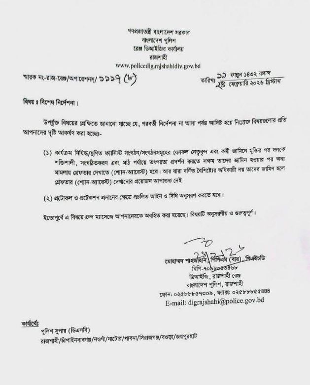 গত মঙ্গলবার রাজশাহী রেঞ্জের উপমহাপরিদর্শক (ডিআইজি) মোহাম্মদ শাহজাহান একটি লিখিত নির্দেশনা দেন। চিঠিতে বলা হয়, ‘কার্যক্রম নিষিদ্ধ সংগঠনের যেসব নেতা-কর্মী জামিনে মুক্তি পাওয়ার পর দলকে শক্তিশালী ও সংগঠিত করতে মাঠপর্যায়ে তৎপর হতে পারেন-তাদের জামিনের পর অন্য মামলায় গ্রেপ্তার দেখাতে (শ্যোন অ্যারেস্ট) হবে। তবে যাদের ক্ষেত্রে এমন সক্রিয়তার সম্ভাবনা নেই, তাদের জামিন হলে নতুন করে গ্রেপ্তার দেখানোর প্রয়োজন নেই বলেও উল্লেখ করা হয়।