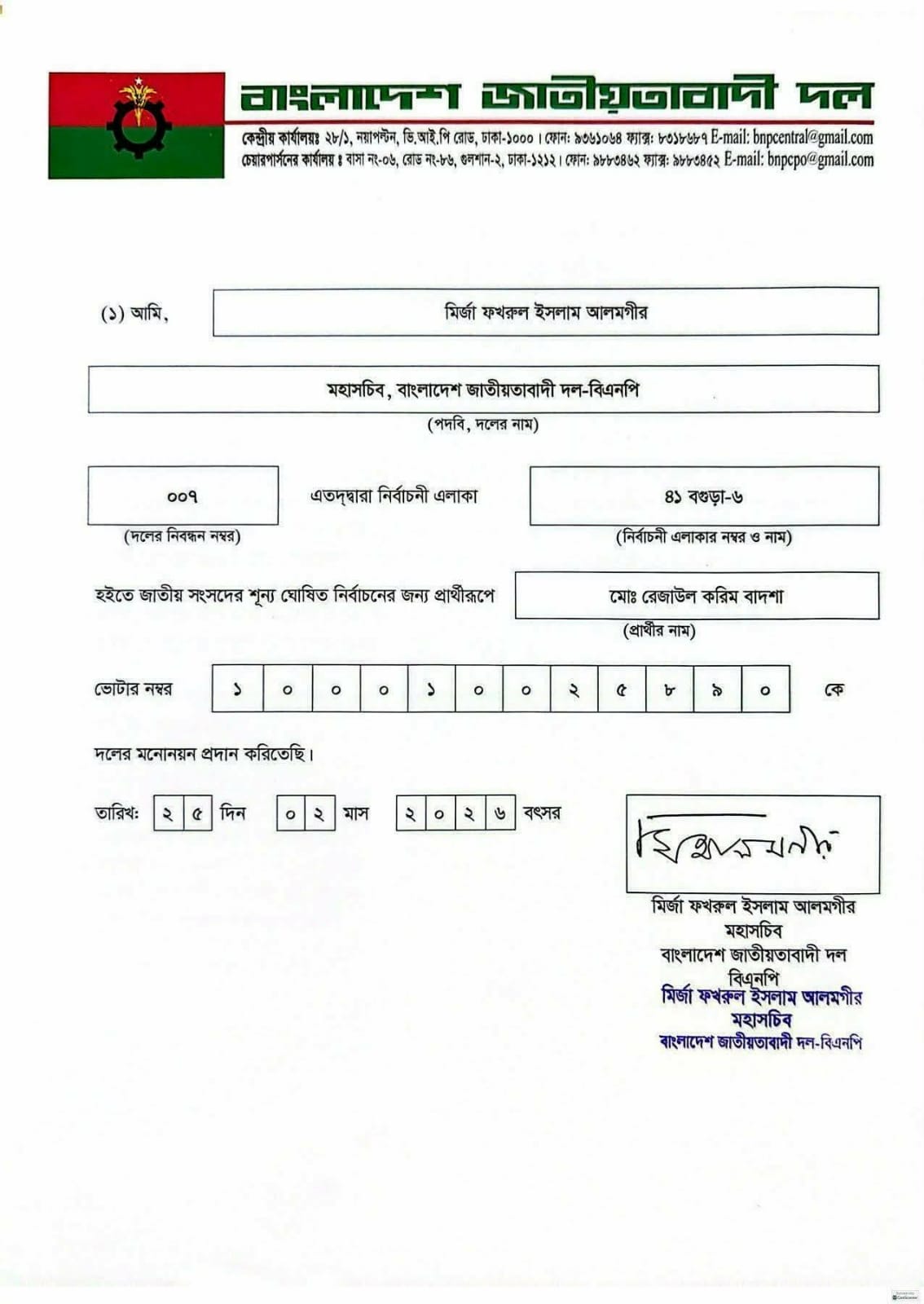 বৃহস্পতিবার (২৬ ফেব্রুয়ারি) বিএনপির পক্ষ থেকে রেজাউল করিম বাদশাকে প্রার্থী হিসেবে চূড়ান্ত করা হয়। দলের মহাসচিব মির্জা ফখরুল ইসলাম আলমগীর স্বাক্ষরিত দলীয় মনোনয়নের চিঠি সন্ধ্যায় দলের চেয়ারম্যানের গুলশান কার্যালয় থেকে রেজাউল করিমের হাতে তুলে দেওয়া হয়।