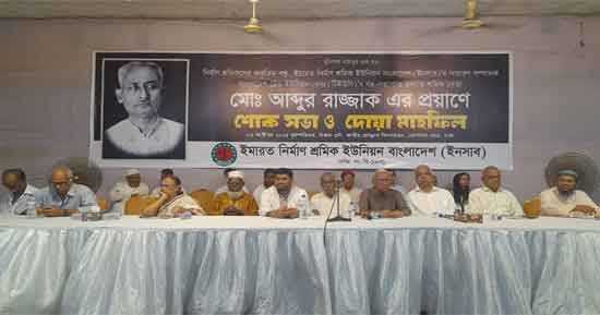 ইমারত নির্মাণ শ্রমিক ইউনিয়ন বাংলাদেশ ইনসাফ’র সাধারণ সম্পাদক এবং বাংলাদেশ ট্রেড ইউনিয়ন কেন্দ্রের সহসভাপতি ও শ্রমিক নেতা আব্দুর রাজ্জাকের প্রয়াণে বৃহস্পতিবার,(২৩ অক্টোবর ২০২৫) বিকেল ৩টায় ইনসাফ এর উদ্যোগে শোক সভা অনুষ্ঠিত হয়েছে। জাতীয় প্রেসক্লাবের মিলায়তনে অনুষ্ঠিত উক্ত শোকসভায় সভাপতিত্ব করেন ইনসাফের সহসভাপতি জালাল আহমেদ, সবাই মরহুম আব্দুর রাজ্জাকের জীবনসংগ্রাম সম্পর্কিত লিখিত বক্তব্য পাঠ করেন ইনসাফের দপ্তর সম্পাদক।