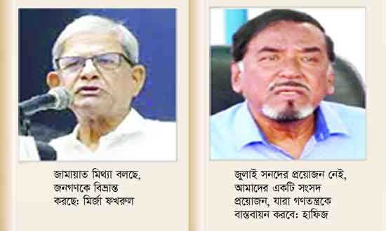 সভায় বিএনপির স্থায়ী কমিটির সদস্য হাফিজ উদ্দিন আহমদ বলেন, দেশের মানুষের একটা ‘সুষ্ঠু নির্বাচন’ প্রয়োজন। আর জুলাই সনদ প্রয়োজন উপদেষ্টাদের মতো কিছু মানুষের, যারা আগামীতে এ দেশে থাকতে গিয়ে নানা প্রশ্নের মুখে পড়বেন। তিনি বলেন, ‘আমি একজন ক্ষুদ্র রাজনৈতিক নেতা হিসেবে, কর্মী হিসেবে মনে করি, জুলাই সনদ দেশের জনগণের প্রয়োজন নাই। আমাদের একটি সংসদ প্রয়োজন, যারা গণতন্ত্রকে বাস্তবায়ন করবে।’