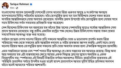এই পরিস্থিতিতে আজ সকালে তারেক রহমান অসুস্থ মায়ের জন্য দোয়া অব্যাহত রাখতে সকলের প্রতি আহ্বান জানান। তার ফেসবুক পোস্টে তিনি লিখেছেন: