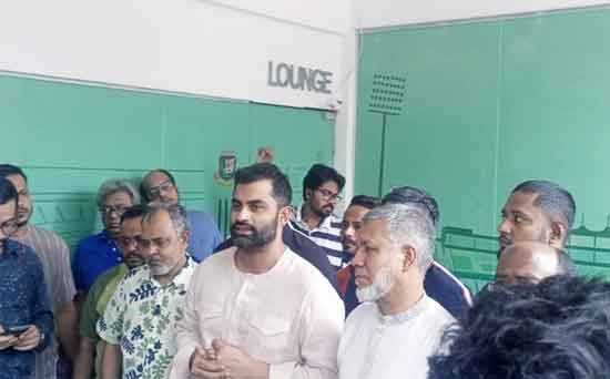 শেরেবাংলা স্টেডিয়ামে সাংবাদিকদের সামনে বক্তব্য রাখেন তামিম ইকবাল