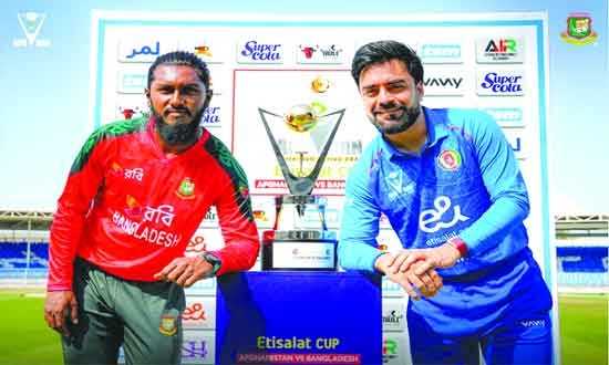 সিরিজের ট্রফি নিয়ে দুই অধিনায়ক বাংলাদেশের জাকের আলি ও আফগানিস্তানের রইশদ খান