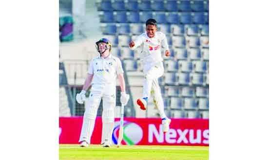 ২৩ ওভারে ৫০ রানে ৩ উইকেট নিয়ে বাংলাদেশের সফল বোলার মিরাজ। অভিষেক টেস্টের প্রথম দিন ২০ ওভার হাত ঘুরিয়ে ৪৭ রানে ২ উইকেট নেন মুরাদ। ১টি করে উইকেট নিয়েছেন হাসান রানা ও তাইজুল।