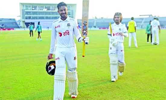 সাদমান-জয়ের পর মোমিনুলের হাফ সেঞ্চুরিতে নিজেদের টেস্ট ইতিহাসে এক ইনিংসে দ্বিতীয়বার বাংলাদেশের প্রথম তিন ব্যাটার হাফ সেঞ্চুরির স্বাদ নিল। এরপর ক্যারিয়ারে প্রথমবার দেড়শ স্পর্শ করেন জয় ছক্কা মেরে, ২৬৫ বলে। শেষ পর্যন্ত ৮৫ ওভারে ১ উইকেটে ৩৩৮ রানে দিন শেষ করেন জয় ও মোমিনুল। ১৪টি চার ও ৪টি ছক্কায় ২৮৩ বলে ক্যারিয়ার সেরা ১৬৯ রানে অপরাজিত জয়। ৫ চার ও ২ ছক্কায় ১২৪ বলে ৮০ রানের অনবদ্য ইনিংস খেলেছেন মোমিনুল।