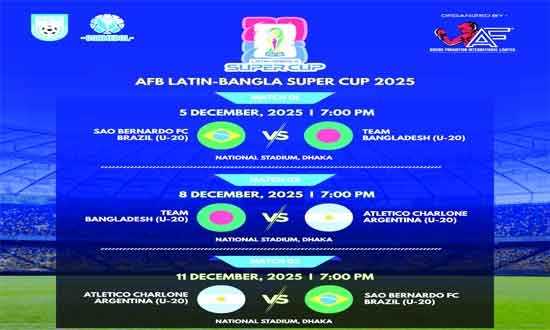 লাতিন বাংলা সুপার কাপ ফুটবলকে ঘিরে ঢাকায় এখন উৎসবমুখর পরিবেশ। টুর্নামেন্টে অংশ নিতে আগেরদিন ঢাকায় আসে ব্রাজিলের সাও বার্নার্দো অনূর্ধ্ব-২০ দল। বুধবার,(০৩ ডিসেম্বর ২০২৫) সকালে এসেছে আর্জেন্টিনার অ্যাথলেটিকো চার্লোন ফুটবল ক্লাব। এই দুই লাতিন পরাশক্তির যুব দলকে নিয়ে স্বাগতিক ফিউচার স্টার বাংলাদেশ আয়োজন করছে ছয় দিনের ফুটবল উৎসব। আয়োজক এএফ বক্সিং প্রমোশন ইন্টারন্যাশনালের দেয়া তথ্য অনুযায়ী, টুর্নামেন্টটি অনুষ্ঠিত হবে ৫-১১ ডিসেম্বর পর্যন্ত। সব ম্যাচই হবে ঢাকা জাতীয় স্টেডিয়ামে। ৫ ডিসেম্বর উদ্বোধনী ম্যাচে মুখোমুখি হবে সাও বার্নার্দো ও ফিউচার স্টার বাংলাদেশ। ৮ ডিসেম্বর অ্যাথলেটিকো চার্লোনের বিপক্ষে মাঠে নামবে বাংলাদেশের তরুণরা। ১১ ডিসেম্বর অনুষ্ঠিত হবে লাতিন ডার্বি। ব্রাজিলের সাও বার্নার্দো মুখোমুখি হবে আর্জেন্টিনার অ্যাথলেটিকো চার্লোনের।