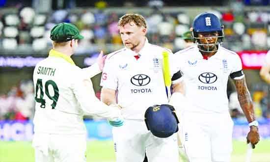 বৃহস্পতিবার, (০৪ ডিসেম্বর ২০২৫) ব্রিসবেনে টস জিতে প্রথমে ব্যাট করতে নেমে ৫ রানে ২ উইকেট হারায় ইংল্যান্ড। তৃতীয় উইকেটে ১১৭ রানের জুটি গড়েন ওপেনার জ্যাক ক্রলি ও রুট। ১১টি চারে ৭৬ রান করা ক্রলিকে থামিয়ে জুটি ভাঙেন পেসার মাইকেল নেসার, দলীয় ১২২ রানে। মিডল অর্ডার ব্যাটাররা সুবিধা করতে পারেনি। এর মধ্যে ব্রুককে (৩১ রান) ফিরিয়ে টেস্টে বাঁহাতি পেসারদের মধ্যে সর্বোচ্চ উইকেটের মালিক হন স্টার্ক। পাকিস্তানের সাবেক অধিনায়ক ওয়াসিম আকরামের ৪১৪ উইকেটের রেকর্ড ভাঙেন তিনি।