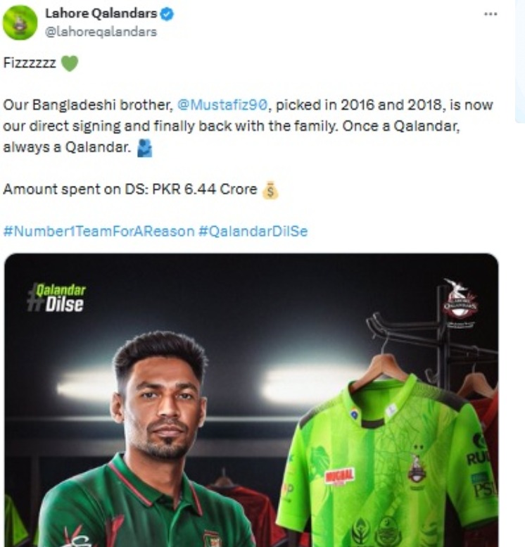 আনুষ্ঠানিক এক বিবৃতিতে লাহোর জানিয়েছে, আমাদের বাংলাদেশি ভাই, মোস্তাফিজুর রহমান যাকে ২০১৬ এবং ২০১৮ সালে দলে নেওয়া হয়েছিল, এখন আমাদের সঙ্গে সরাসরি চুক্তিবদ্ধ। অবশেষে পরিবারের মাঝে আবারও ফিরে এসেছেন।